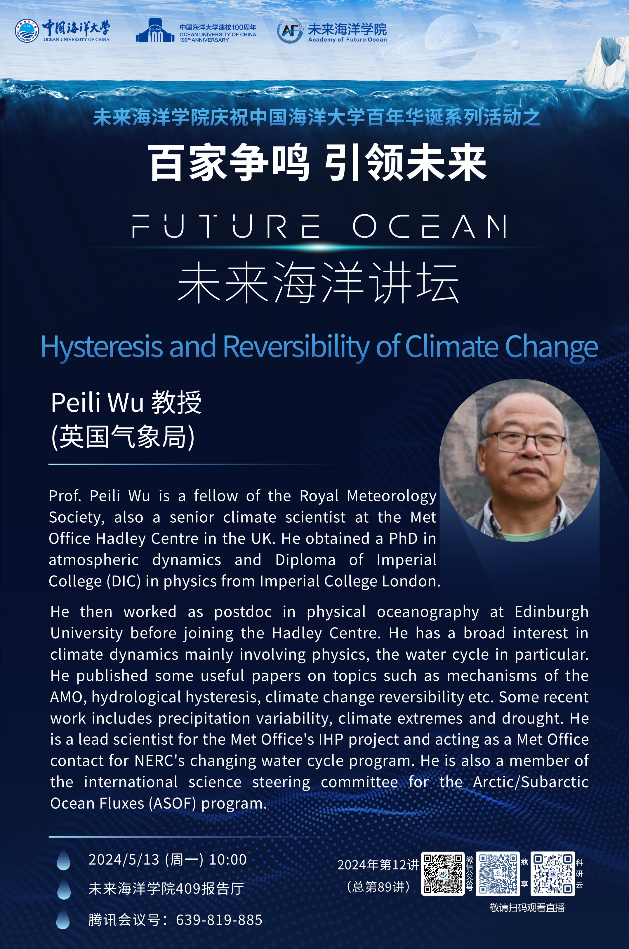 • 百家争鸣 引领未来丨未来海洋讲坛第89讲 (2024年第12讲) -Peili Wu: Hysteresis and Reversibility of Climate Change