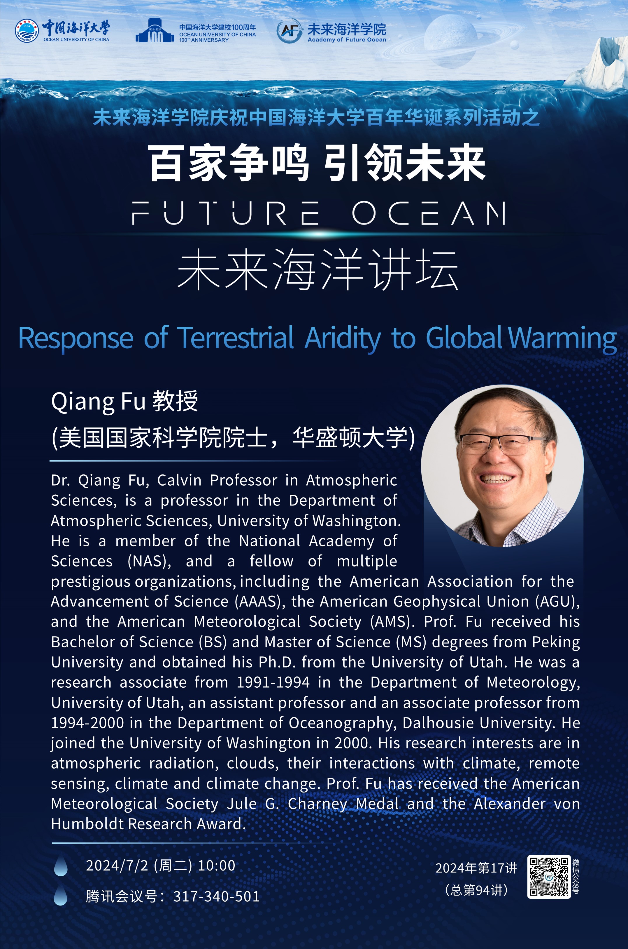 • 百家争鸣 引领未来丨未来海洋讲坛第94讲 (2024年第17讲) -Qiang Fu:Response of Terrestrial Aridity to Global Warming